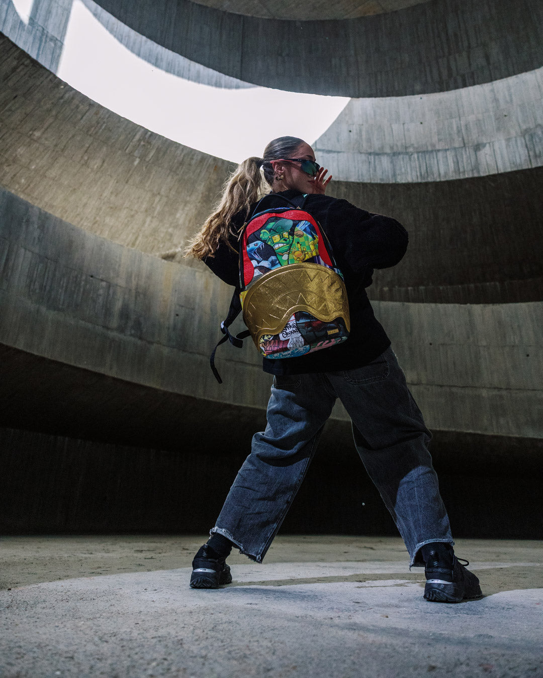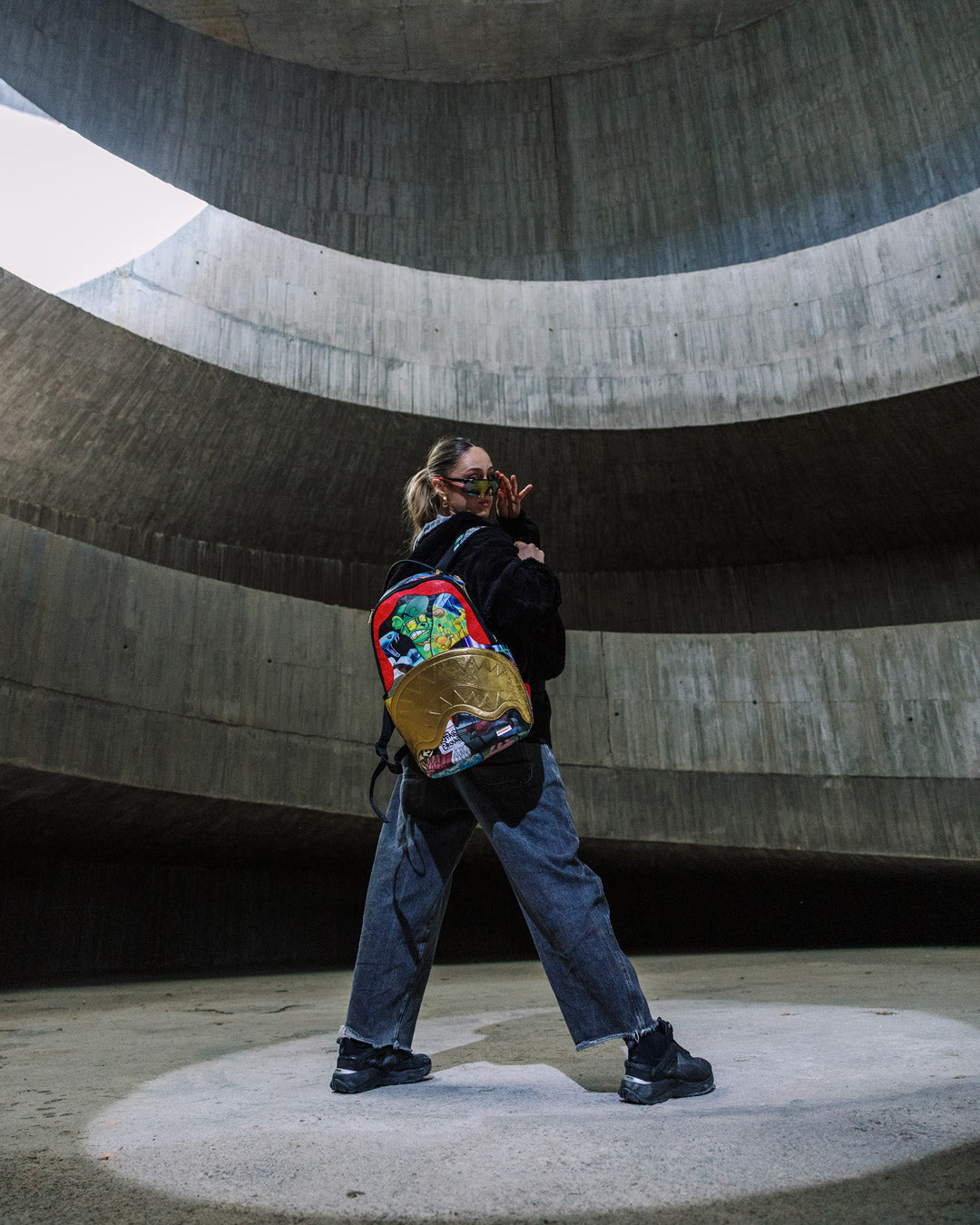 Dimensions: 18" x 6" x 11.5" • Front zipper pocket • Side pockets • Zippered Stash pocket • Separate velour sunglass compartment • Ergonomic mesh back padding • Adjustable Straps for custom sizing • Gold zippers with metal hardware • Metal "Sprayground Authentic" badge • Slide through back sleeve connects to carry-on luggage to free your hands