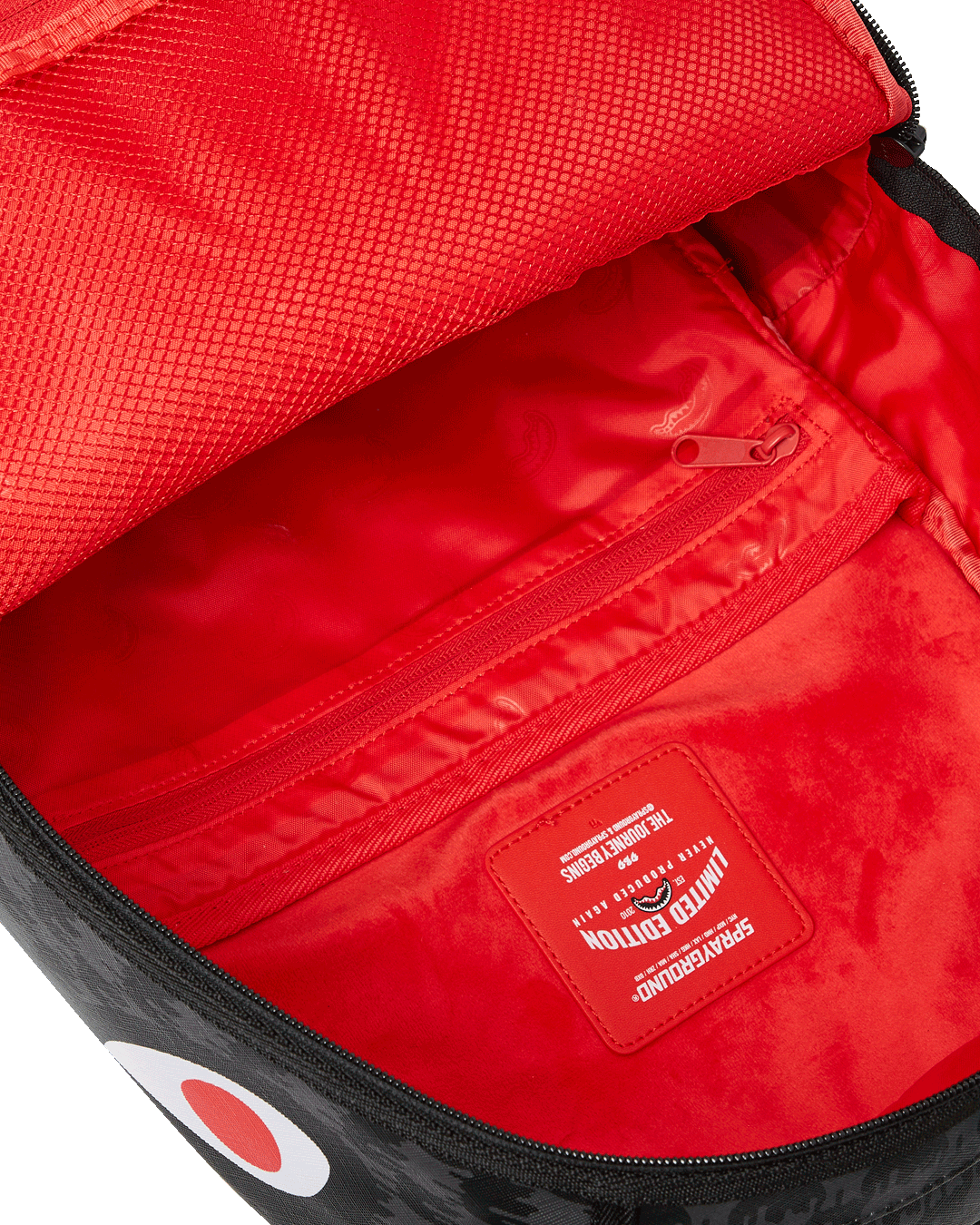 Dimensions: 18" x 6" x 11.5" • Front zipper pocket • Side pockets • Zippered Stash pocket • Separate velour sunglass compartment • Ergonomic mesh back padding • Adjustable Straps for custom sizing • Gold zippers with metal hardware • Metal "Sprayground Authentic" badge • Slide through back sleeve connects to carry-on luggage to free your hands