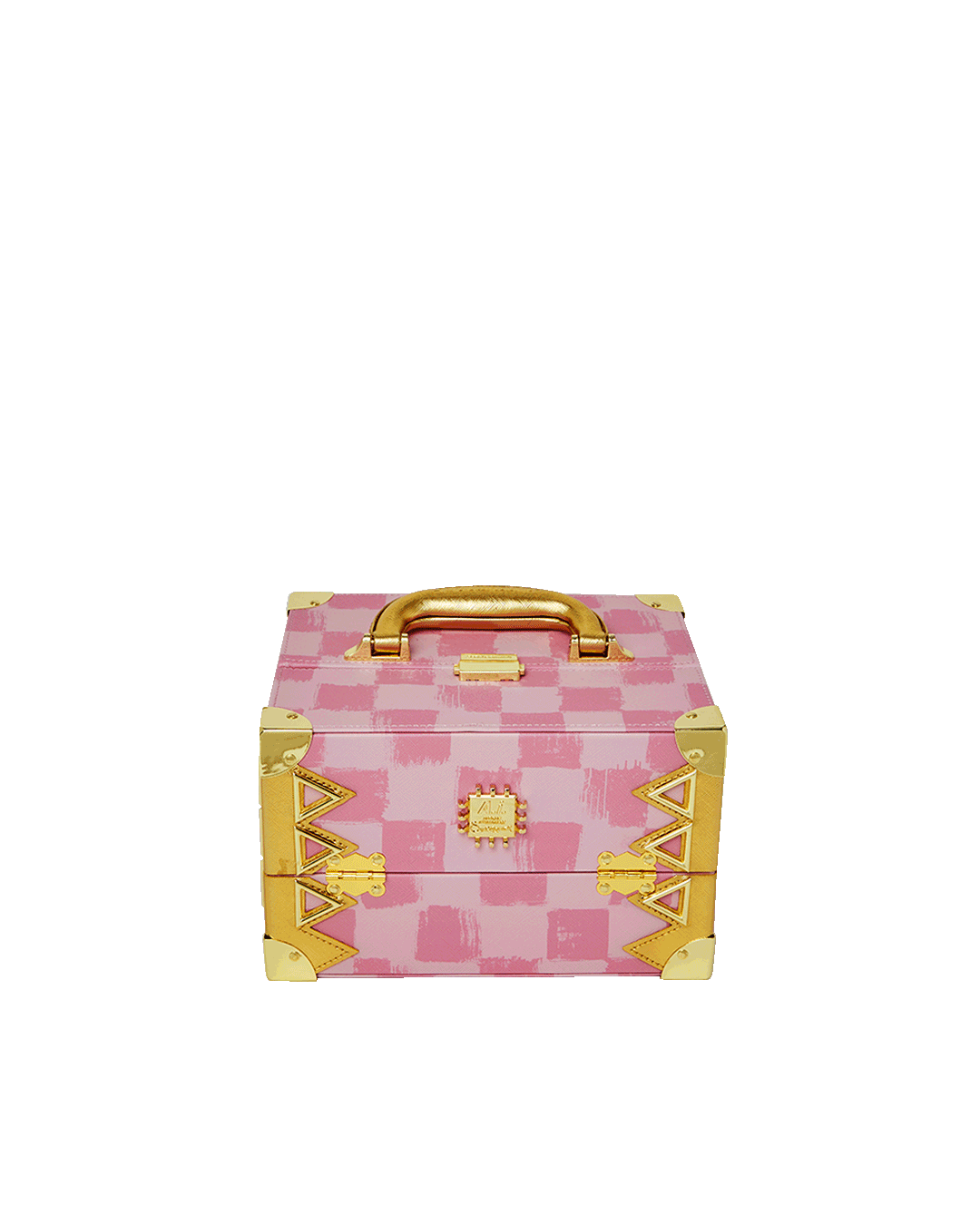 Pink velour lining, Tiered shelving, removable tray, interior mirror.