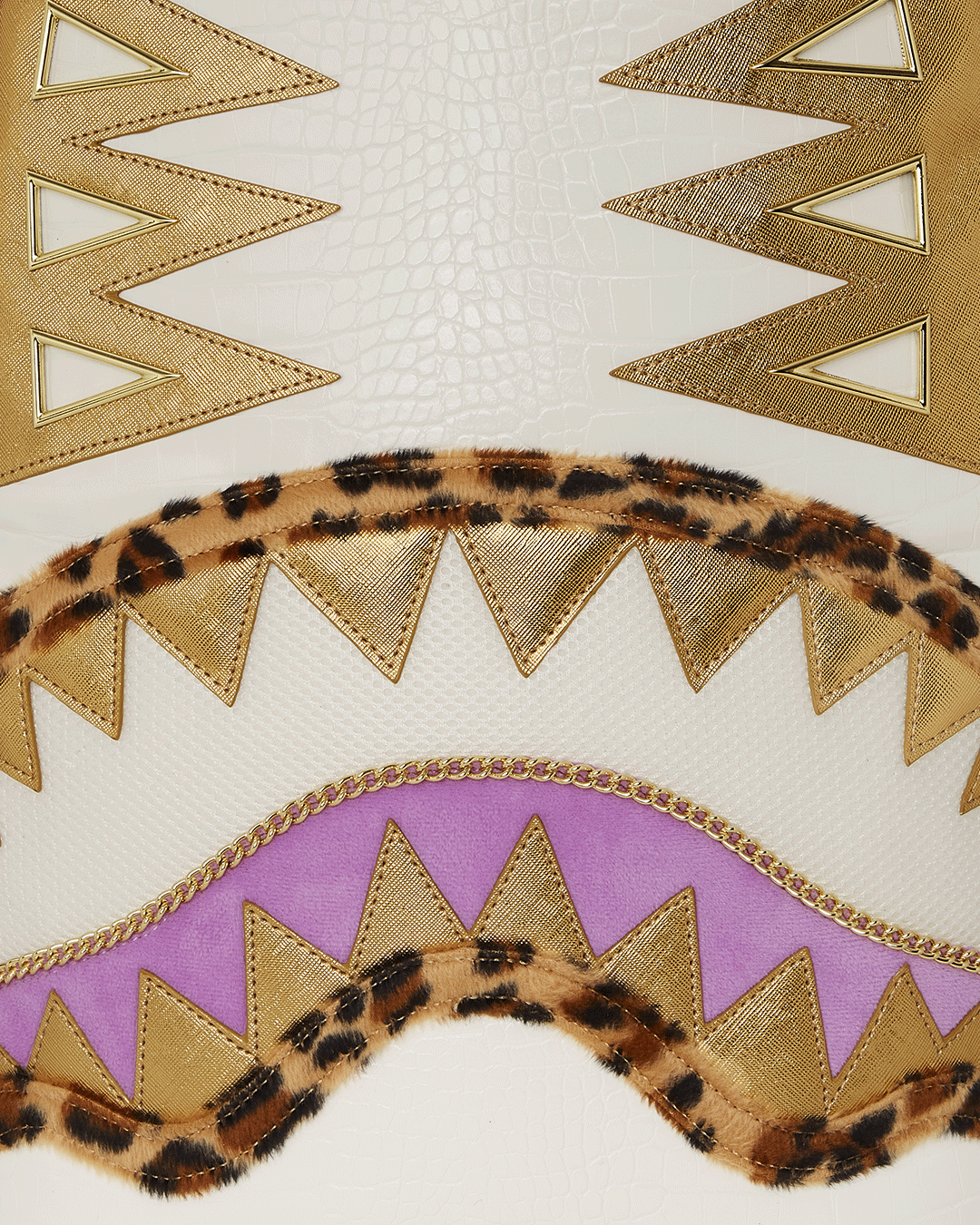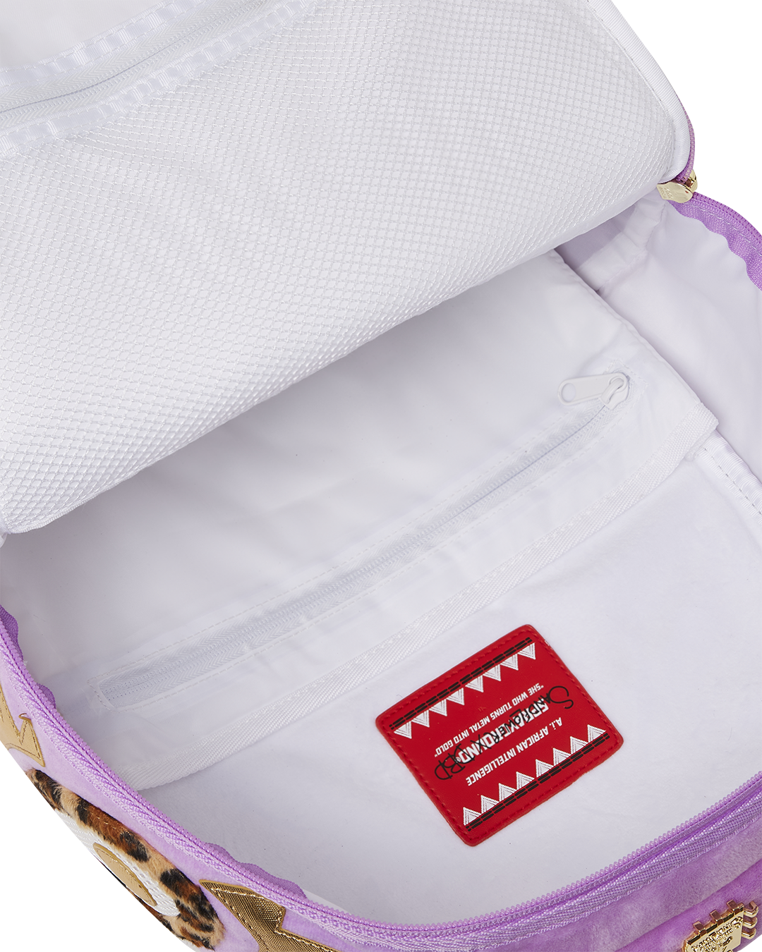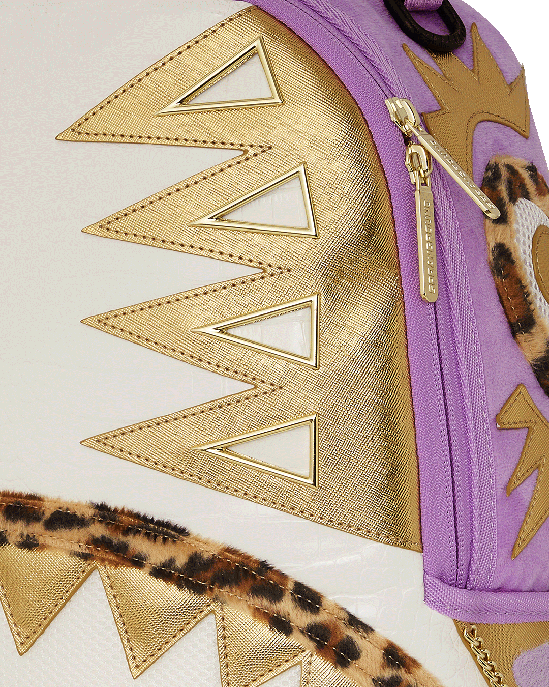 Dimensions: 18" x 6" x 11.5" • Front zipper pocket • Side pockets • Zippered Stash pocket • Separate velour sunglass compartment • Ergonomic mesh back padding • Adjustable Straps for custom sizing • Gold zippers with metal hardware • Metal "Sprayground Authentic" badge • Slide through back sleeve connects to carry-on luggage to free your hands