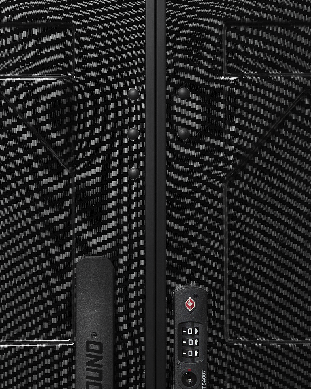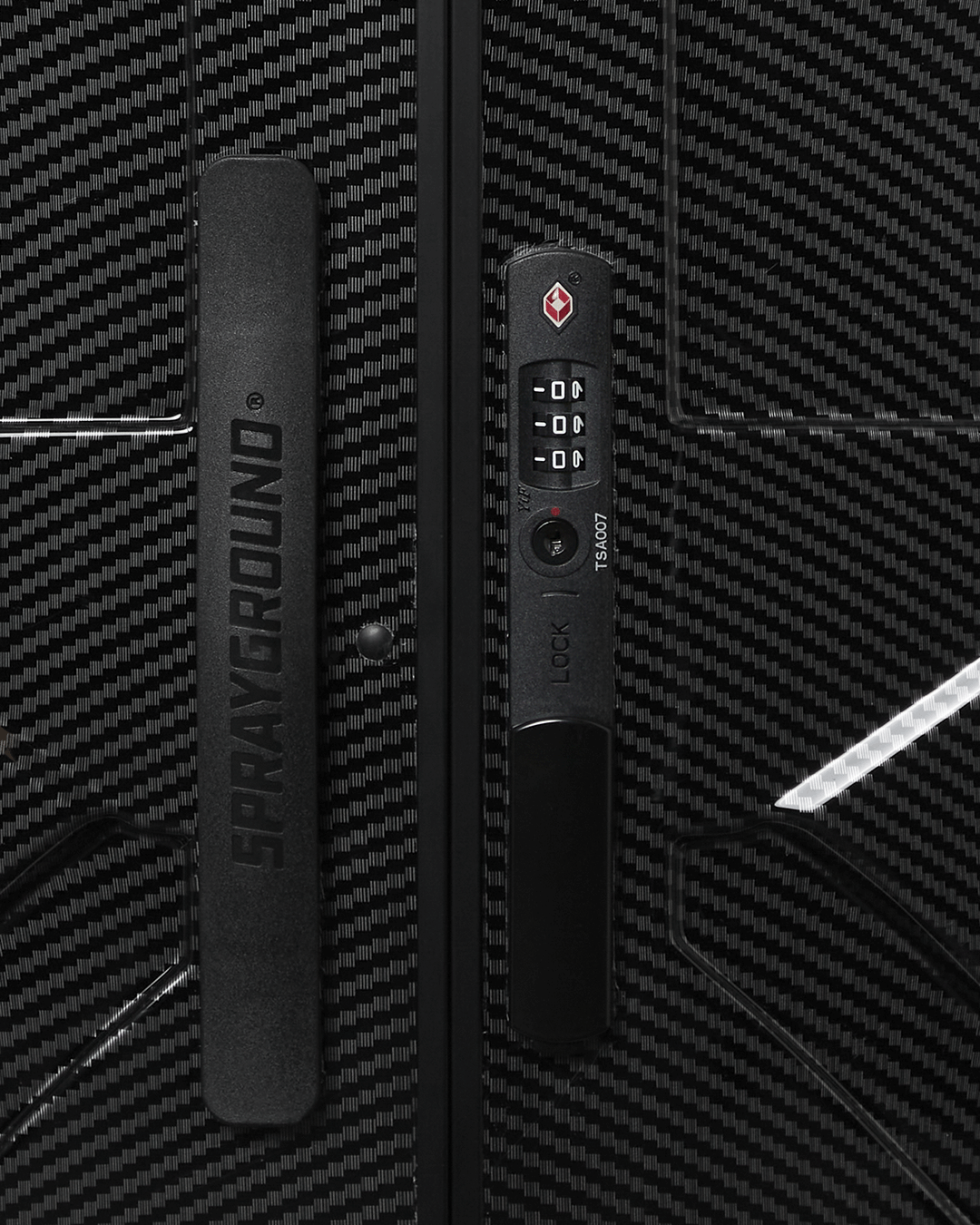 Faux carbon fiber full size luggage. Features an embossed shark mouth.