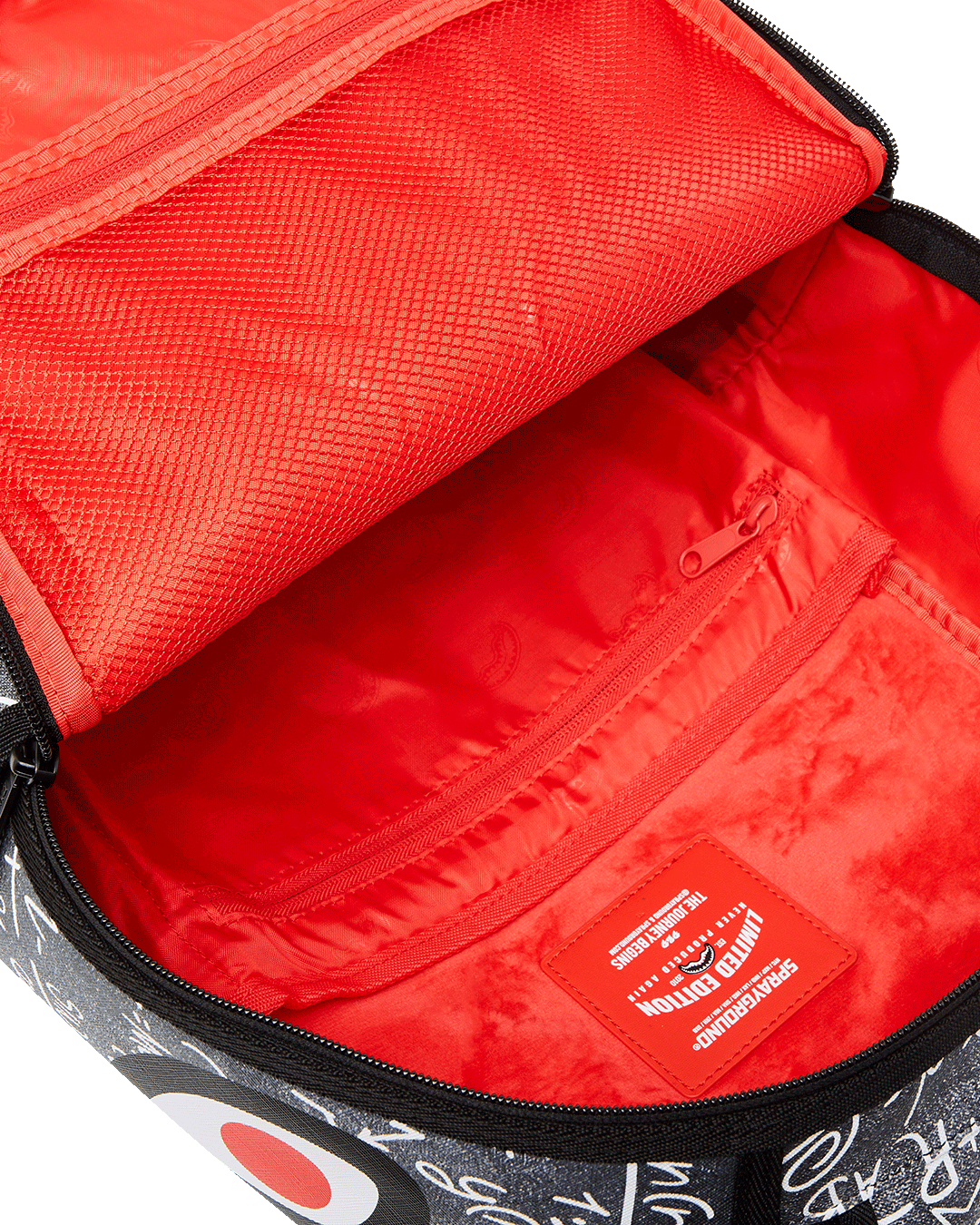 Dimensions: 18" x 6" x 11.5" • Front zipper pocket • Side pockets • Zippered Stash pocket • Separate velour sunglass compartment • Ergonomic mesh back padding • Adjustable Straps for custom sizing • Gold zippers with metal hardware • Metal "Sprayground Authentic" badge • Slide through back sleeve connects to carry-on luggage to free your hands