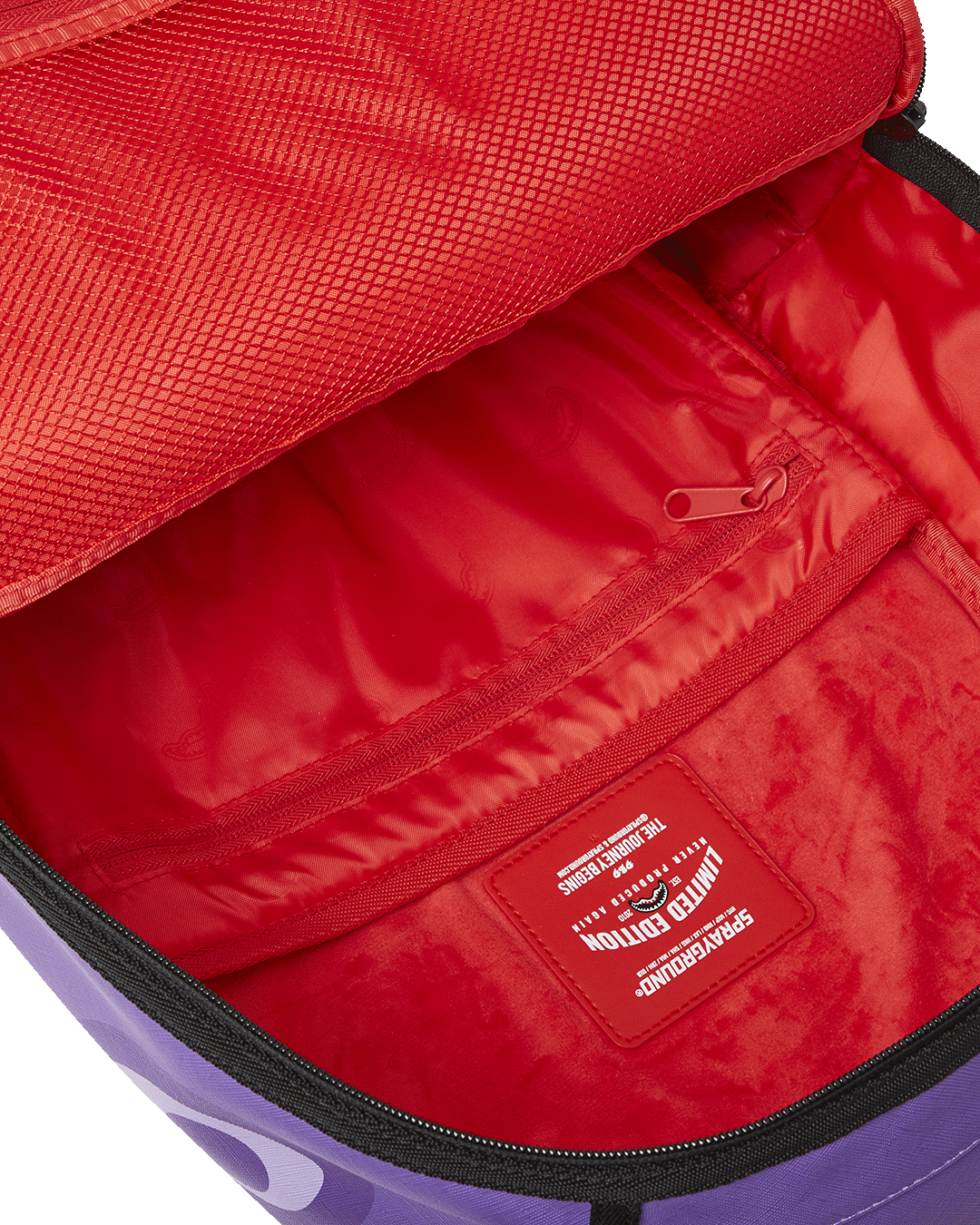 Dimensions: 18" x 6" x 11.5" • Front zipper pocket • Side pockets • Zippered Stash pocket • Separate velour sunglass compartment • Ergonomic mesh back padding • Adjustable Straps for custom sizing • Gold zippers with metal hardware • Metal "Sprayground Authentic" badge • Slide through back sleeve connects to carry-on luggage to free your hands