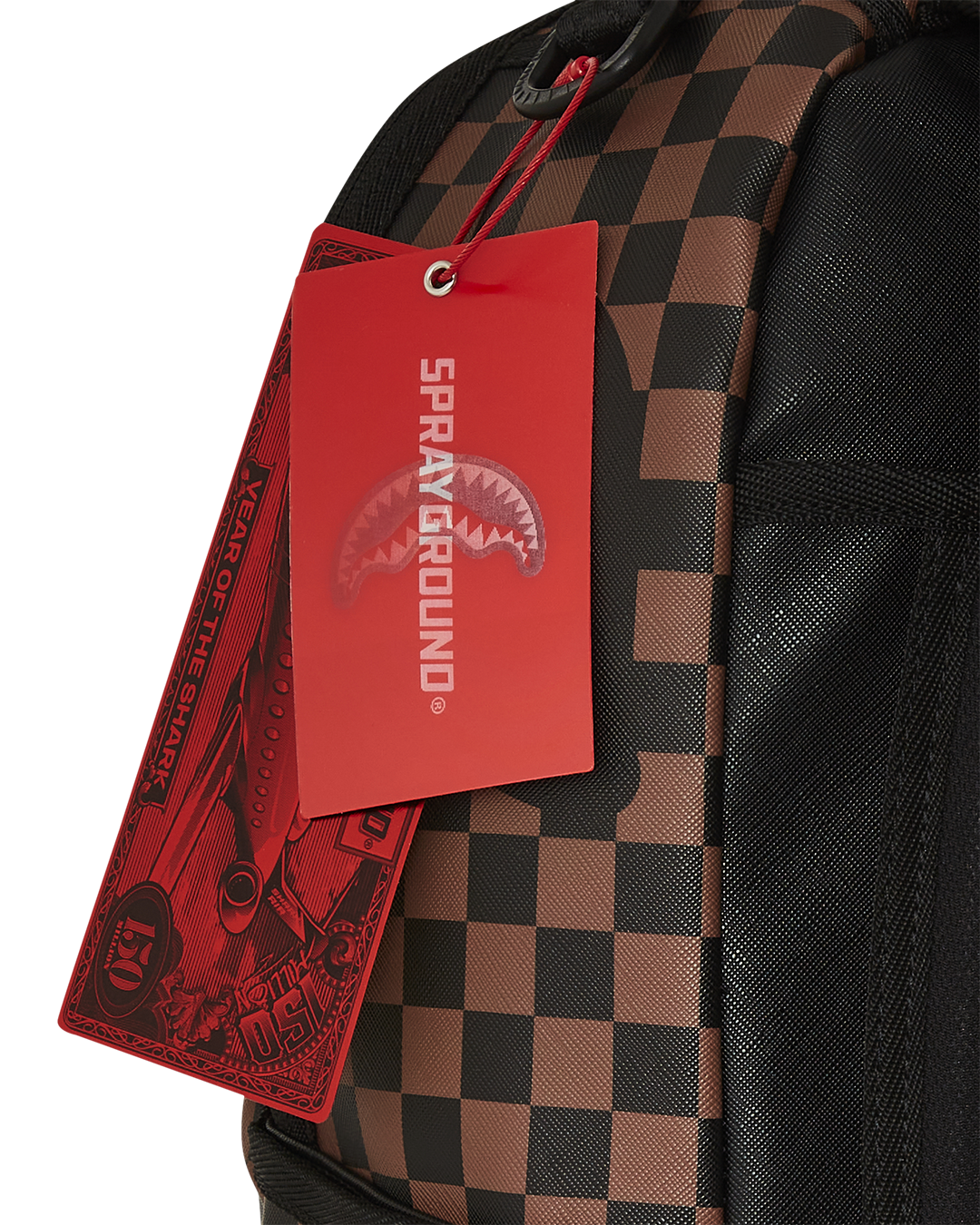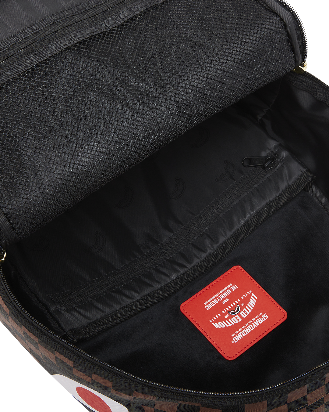 Dimensions: 18" x 6" x 11.5" • Front zipper pocket • Side pockets • Zippered Stash pocket • Separate velour sunglass compartment • Ergonomic mesh back padding • Adjustable Straps for custom sizing • Gold zippers with metal hardware • Metal "Sprayground Authentic" badge • Slide through back sleeve connects to carry-on luggage to free your hands