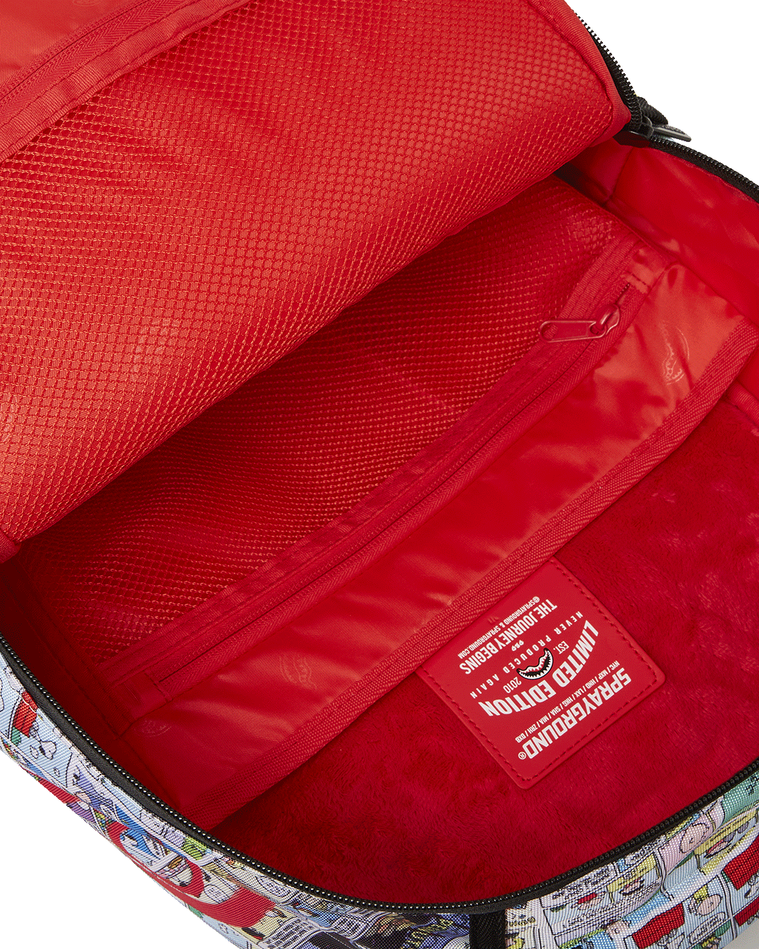 Dimensions: 18" x 6" x 11.5" • Front zipper pocket • Side pockets • Zippered Stash pocket • Separate velour sunglass compartment • Ergonomic mesh back padding • Adjustable Straps for custom sizing • Gold zippers with metal hardware • Metal "Sprayground Authentic" badge • Slide through back sleeve connects to carry-on luggage to free your hands