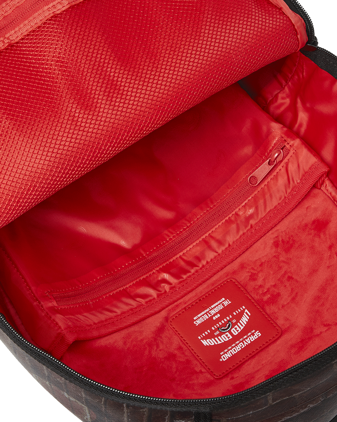 Dimensions: 18" x 6" x 11.5" • Front zipper pocket • Side pockets • Zippered Stash pocket • Separate velour sunglass compartment • Ergonomic mesh back padding • Adjustable Straps for custom sizing • Gold zippers with metal hardware • Metal "Sprayground Authentic" badge • Slide through back sleeve connects to carry-on luggage to free your hands