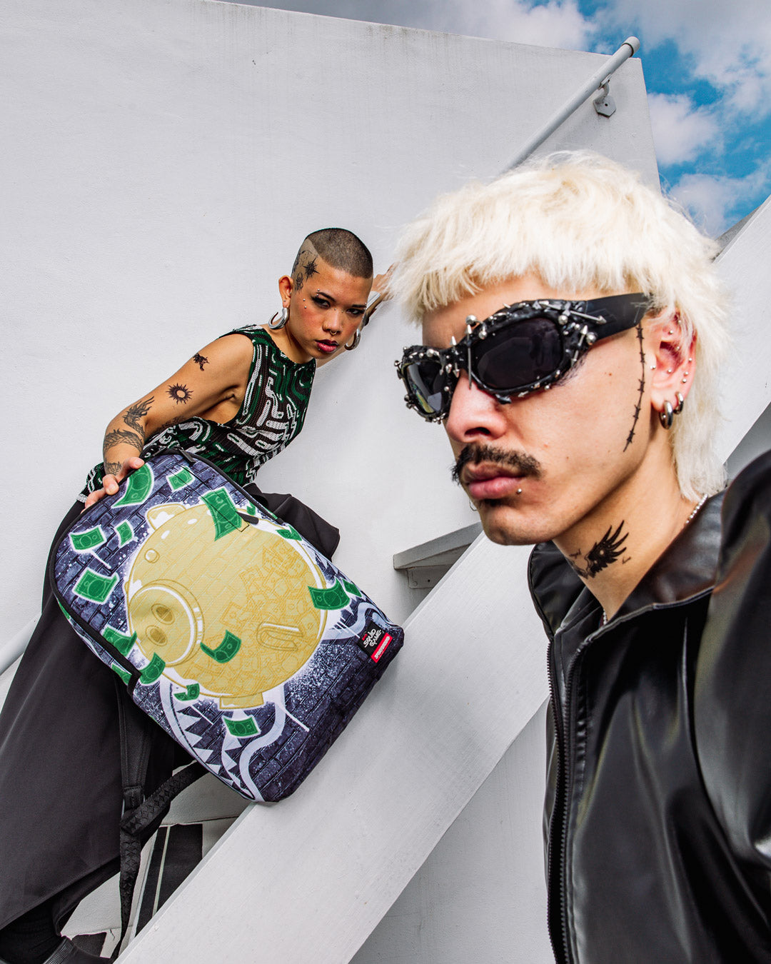 Dimensions: 18" x 6" x 11.5" • Front zipper pocket • Side pockets • Zippered Stash pocket • Separate velour sunglass compartment • Ergonomic mesh back padding • Adjustable Straps for custom sizing • Gold zippers with metal hardware • Metal "Sprayground Authentic" badge • Slide through back sleeve connects to carry-on luggage to free your hands