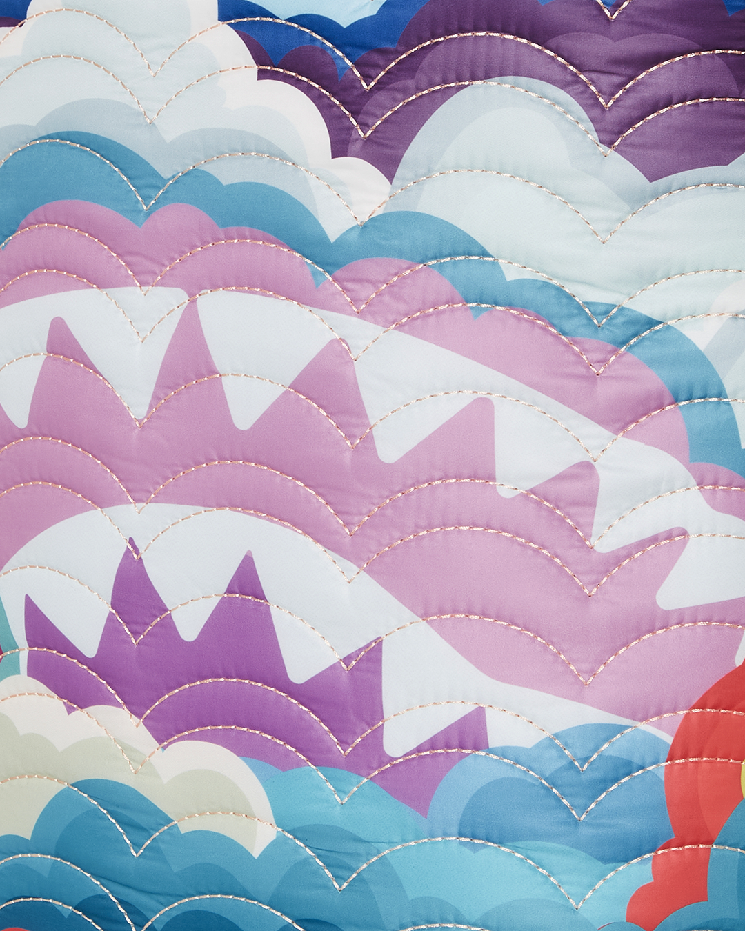 100% Polyester. Sublimated in a soft rainbow print and quilted in a cloud design.
