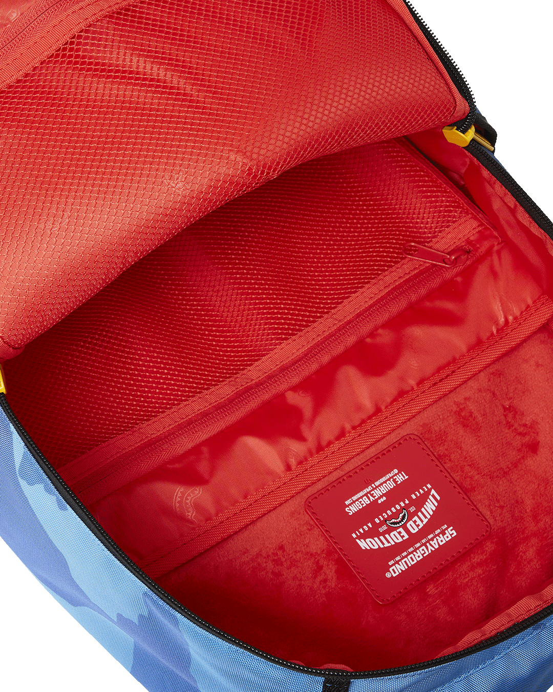 Dimensions: 18" x 6" x 11.5" • Front zipper pocket • Side pockets • Zippered Stash pocket • Separate velour sunglass compartment • Ergonomic mesh back padding • Adjustable Straps for custom sizing • Gold zippers with metal hardware • Metal "Sprayground Authentic" badge • Slide through back sleeve connects to carry-on luggage to free your hands