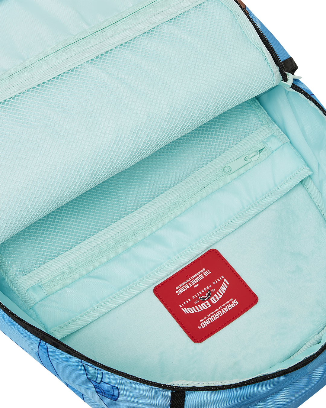 Dimensions: 18" x 6" x 11.5" • Front zipper pocket • Side pockets • Zippered Stash pocket • Separate velour sunglass compartment • Ergonomic mesh back padding • Adjustable Straps for custom sizing • Gold zippers with metal hardware • Metal "Sprayground Authentic" badge • Slide through back sleeve connects to carry-on luggage to free your hands